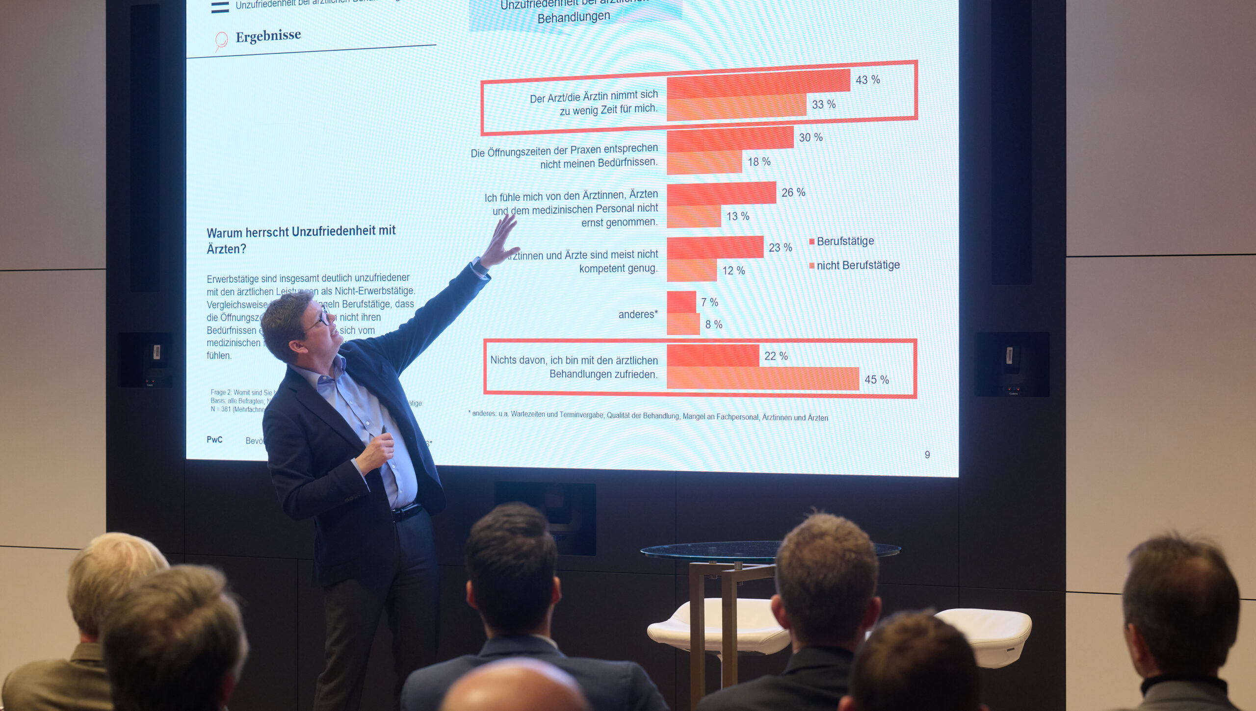 Zu Beginn der Veranstaltung stellte Michael Ey, Global Health Services Leader bei PwC Deutschland, die Ergebnisse des gerade veröffentlichten „Healthcare Barometer 2026“ vor, eine repräsentative Bevölkerungsbefragung zum deutschen Gesundheitswesen. Die Studie fokussiert die allgemeine Zufriedenheit der Deutschen mit dem Gesundheitswesen sowie die Einschätzung zu Krankenversicherungen (GKV und PKV), zur Pharmabranche als auch zu Digitalisierung, Integration und Prävention. Ey zeigte auf, dass die Deutschen sich Sorgen um die Finanzierbarkeit von Gesundheit machen. Steigende Kosten, Fachkräftemangel, ein hohes Maß an Bürokratie, lange Wartezeiten auf Termine und eine schleppende Digitalisierung: Das sind nur einige der großen Herausforderungen des deutschen Gesundheitswesens. Auch die Bürgerinnen und Bürger haben wohl erkannt, wie sehr das System kränkelt: Nur noch 50 Prozent zählen ihr Gesundheitswesen zu den Top-3-Systemen weltweit.